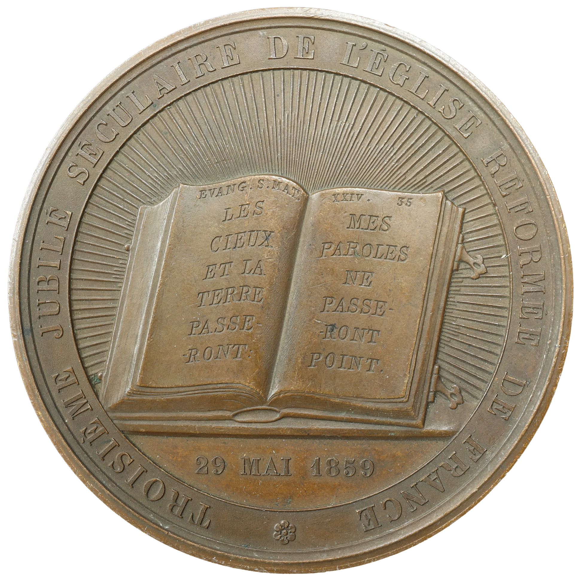 Reverse legend: (FLOWER) THIRD SECULAR JUBILEE OF THE REFORMED CHURCH OF FRANCE // EVAN. S.MAT. / THE / HEAVENS / AND THE / EARTH / PASS- / WILL // XXIV. 35 / MY WORDS / DOES NOT / PASS - / WILL / POINT // IN EXERGUE: MAY 29, 1859.