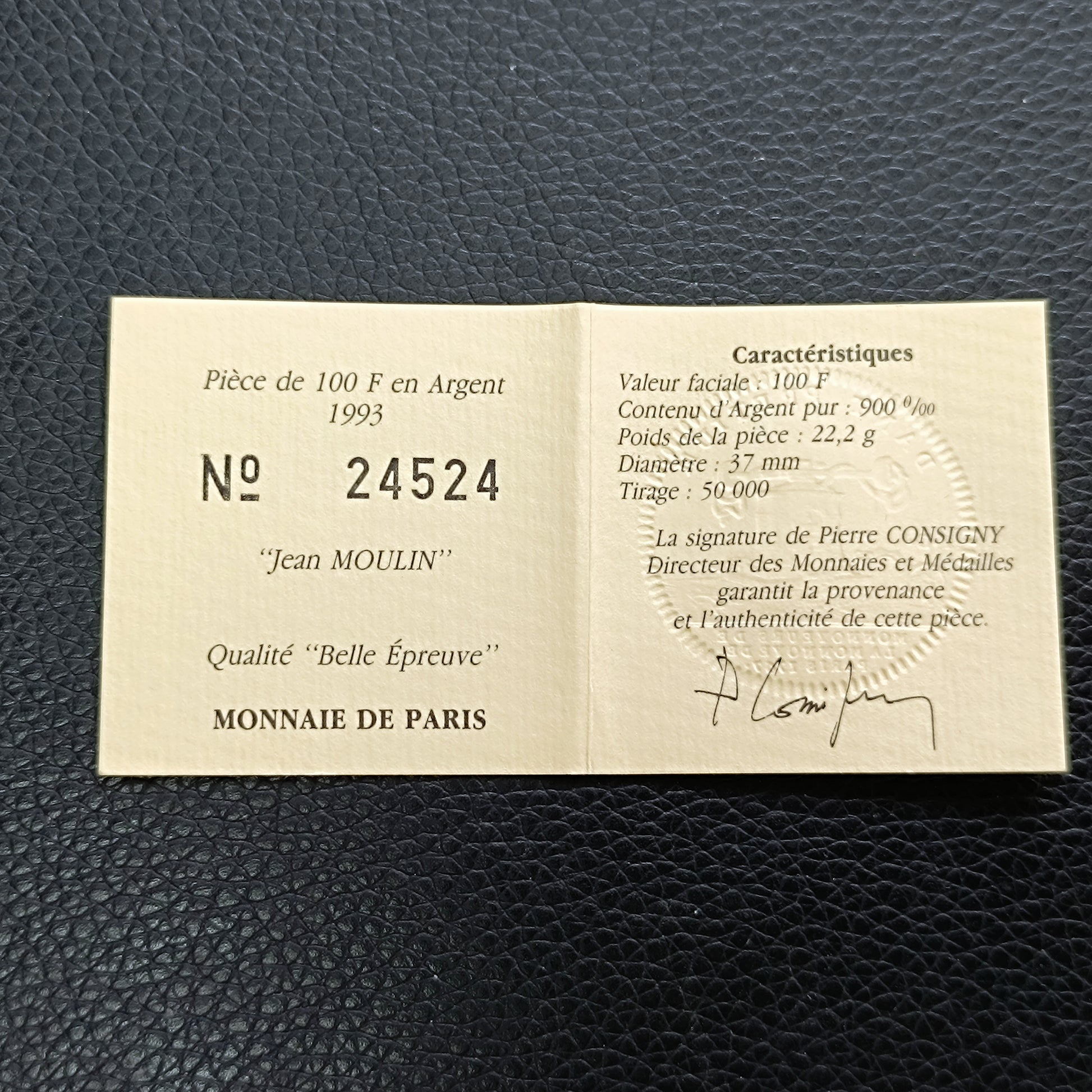 Monnaie de Paris 100 Francs Jean Moulin Conseil National de la Résistance 1993 Coffret BE Argent 22.2 gr
